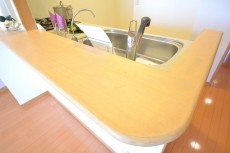 カウンター付きのオープンキッチンはリビングにいる家族と会話を楽しみながら、