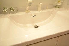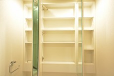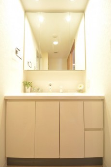 ホワイト基調の洗面化粧台は3面鏡の裏が一面収納になっています。