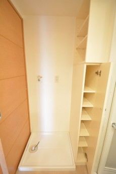 洗面化粧台の真後ろは洗濯機置場。横にはリネン庫もあります。