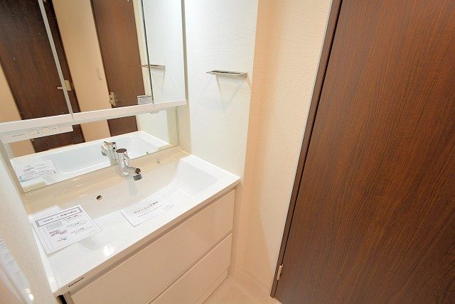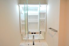 シャンプードレッサータイプでボウルが大きく使いやすい洗面台は三面鏡裏収納など機能的。