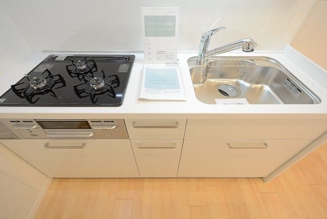 キッチン設備は3口ガスコンロ、グリルに浄水器一体型水栓と食洗機もついて充実しています。