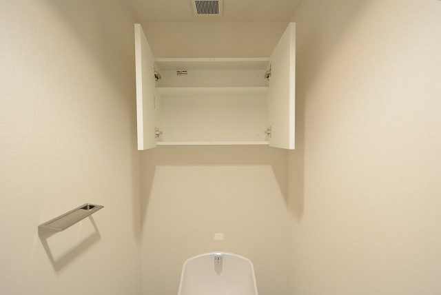 左側のドアはトイレ。 もちろんウォシュレット付きで吊戸棚も設置されています。