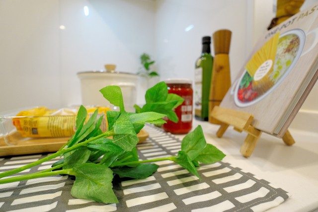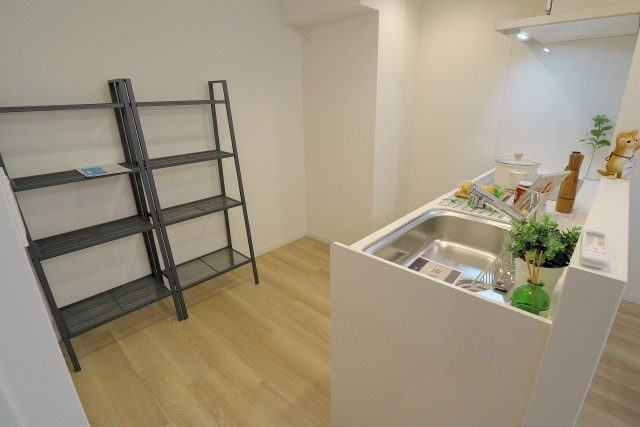 キッチン下部の収納には調理器具、後ろの棚には食材や食器、そしてキッチン東側の小さな長いカウンタースペースにはいろいろな調味料をオシャレに置いておけば、お料理がとてもはかどりそうです(^_-)-☆