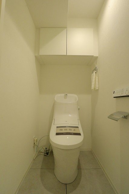 サニタリールームの隣にはトイレがあります。上部に大きな吊り棚が設置されていますので、トイレ内を清潔にお使い頂けます(^o^)