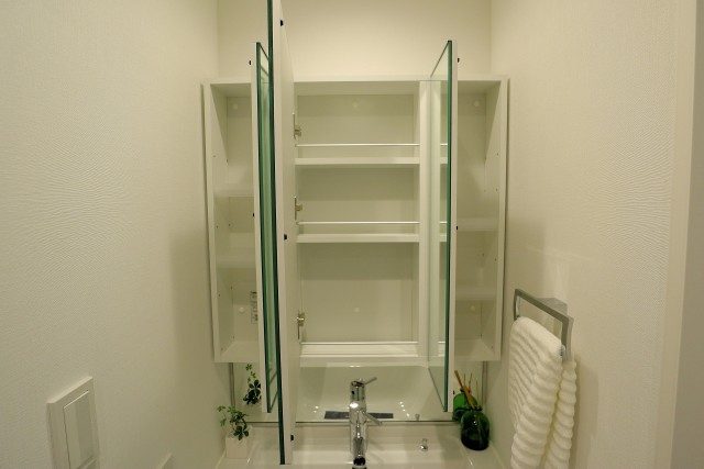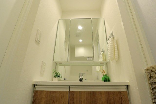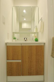 洗面化粧台は鏡の裏、引き出しと収納スペースが豊富です。