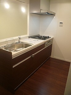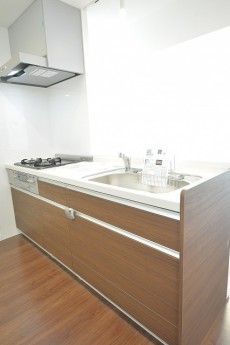 システムキッチン。はフローリングと同じく落ち着いた色合いの木目柄。