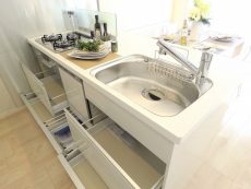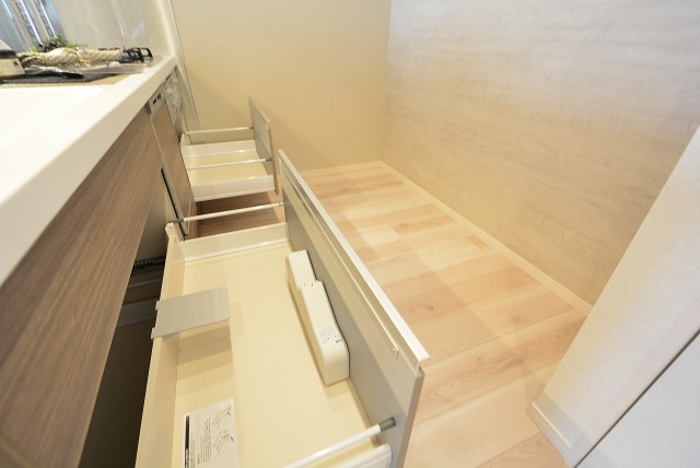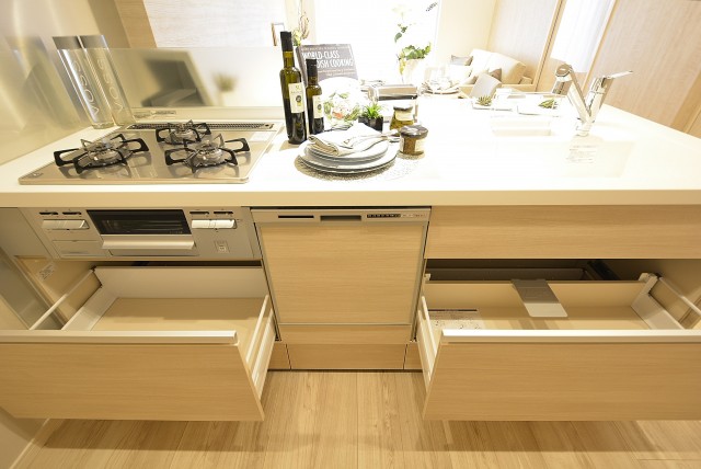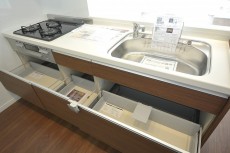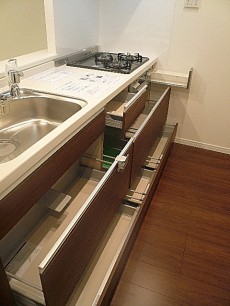 調理スペースも充分にあり、収納は足元まである引き出し収納。引き出し収納はひと目でわかり、整理整頓もしやすいですね