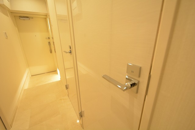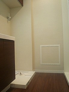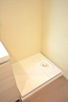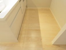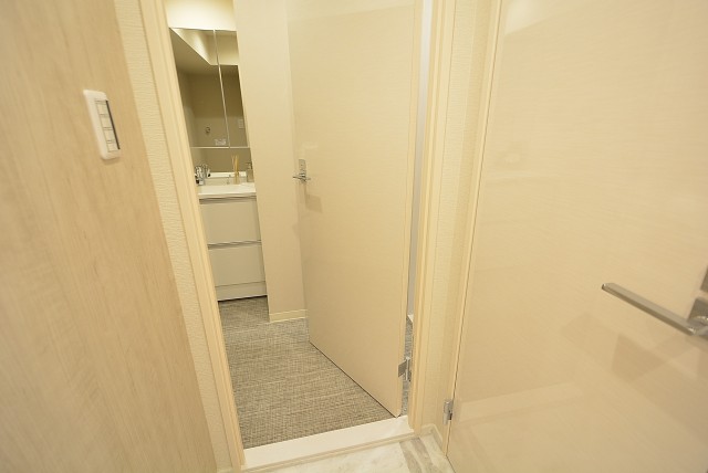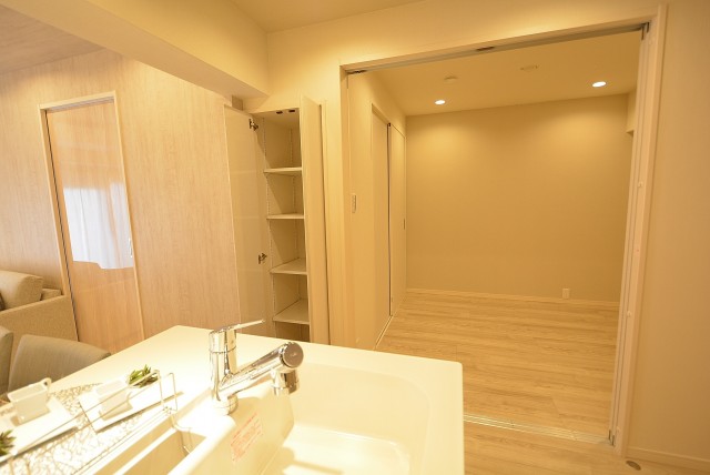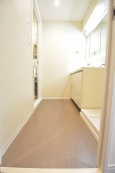 サニタリールームです。左側に洗面台並びに洗濯機置き場、右側にトイレ並びに浴室です。