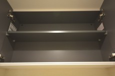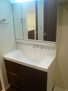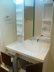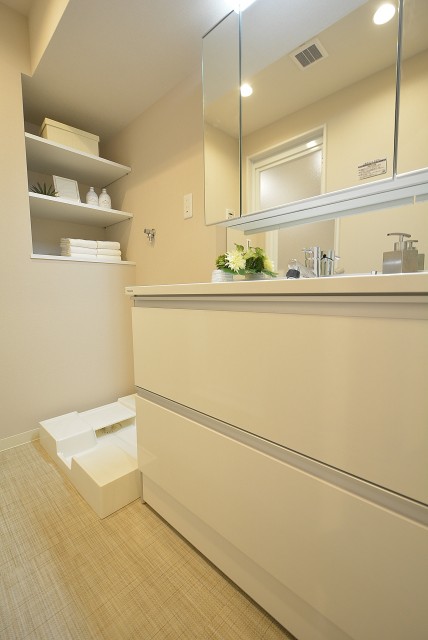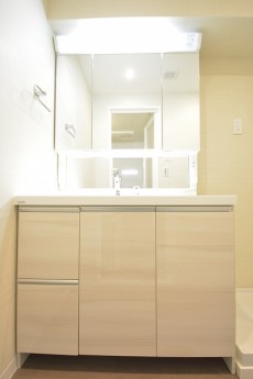大きな三面鏡付きの洗面台です。スクエア型のウォッシュボウルがスタイリッシュです。収納はもちろん上下にあります。三面鏡裏には細かいヘアーゴムや歯ブラシセットなど、下にはシャンプーなどのストック類を置いてはいかがでしょうか。引き出しもあり、タオルをクルクル巻いて収納なんかもできそうですね。