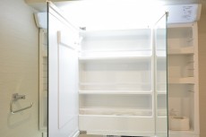 洗面化粧台の3面鏡の裏は一面収納になっており、ハブラシ類などゴチャゴチャ