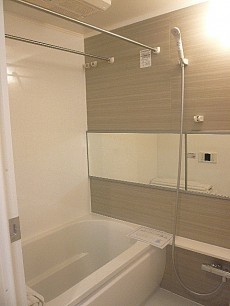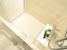 うすーいベージュの木目柄パネルが使われたくつろぎを感じるバスルーム。