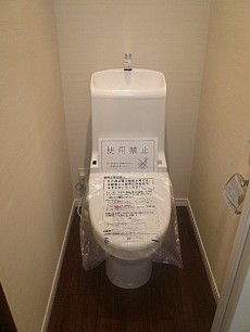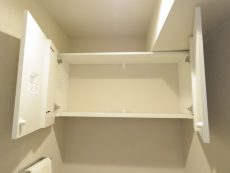 TOTO製洗浄便座付きトイレです。ホワイトの吊棚は圧迫感もなくトイレットペーパーのストックに役立ちますね、
