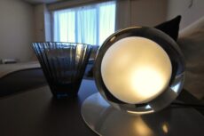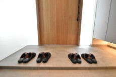 広さのある玄関は高級感のある大理石貼り。壁全体が光っているように見えるのは、ガラスに和紙のようなものが貼られた透過性のある素材を使用しているためです。