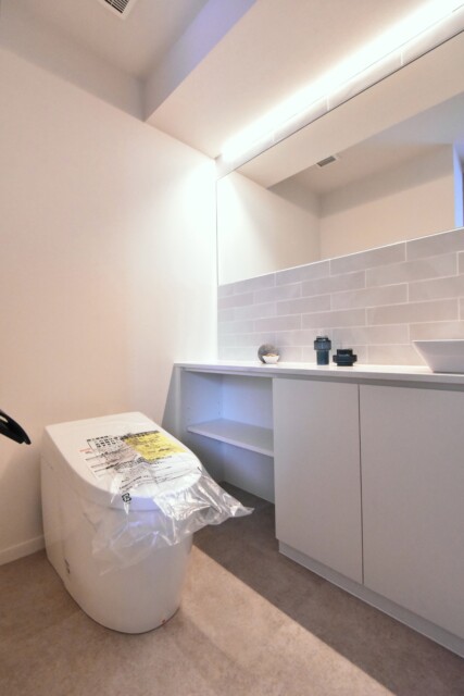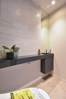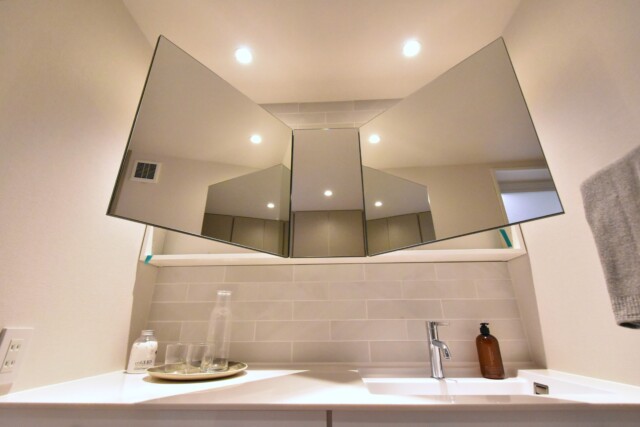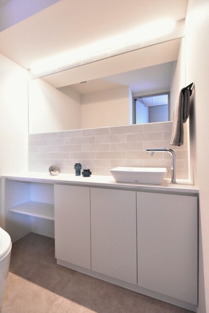 大きな鏡の付いた手洗いカウンター。カウンターにはいろいろ飾ってインテリアを楽しめますし、棚はトイレットペーパーなどの収納にも便利です。