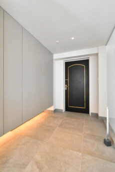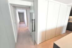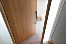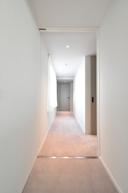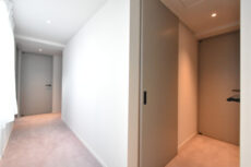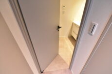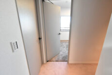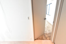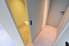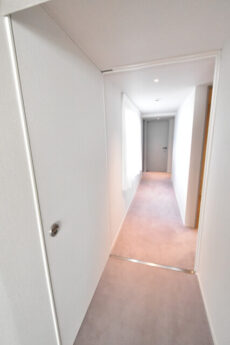 廊下途中に広い物件で時々見かける防火扉が付いていました。鉄板むき出しのことも多いのですが、周りと同じ壁紙が張られ目立たないようになっています。
