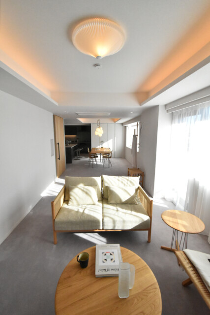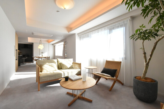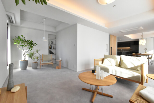 LDKの床はALL絨毯張り。色は無機質なグレーなのに、柔らかな質感のせいか不思議と温かみを感じます。