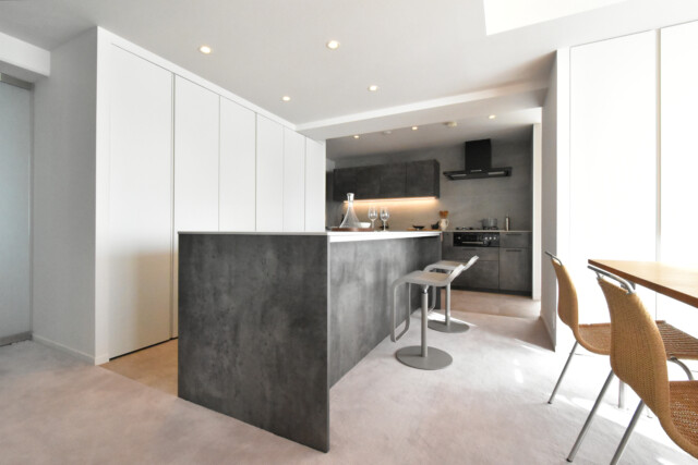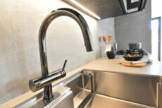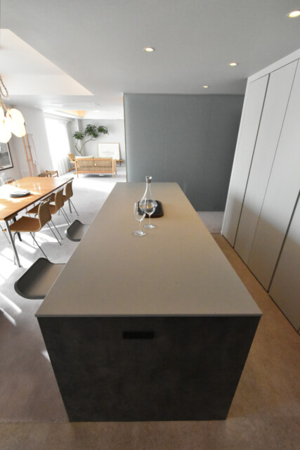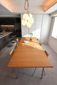 ダイニングとキッチンの間にはオープンカウンター。お酒を飲んだり、朝食を食べたり、ホームパーティーなど来客時にはテーブルとして使ったり、ご家族みんなでお料理をする時には拡張調理台として使ったり、、、幅広く使えるスペースです。