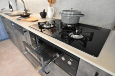 コンロは3口、グリル付き。温度設定やタイマー機能などが付いた高機能タイプです。