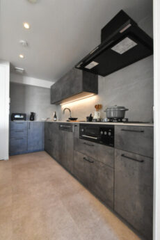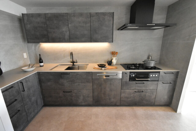 ダークトーンのパネルを使用した落ち着いた雰囲気のキッチンです。窓からの光が入りづらいのもあるかもしれませんね。家電を置いたり作業したりするスペースをたっぷりとれるL字型です。