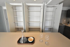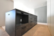 オープンカウンター付近には収納が集結。カウンター下にはたくさんのスライドキャビネットの他にも、炊飯器などを置けるよう換気扇が付いたスペースもついています。後ろも全面収納棚!