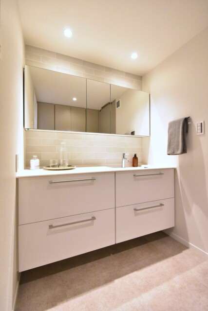 洗面室には洗面化粧台と浴室、リネン庫があり脱衣スペースも兼ねています。