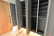玄関の照明は人感センサー付き。自動でライトのON・OFFをしてくれるので暗い中手探りでスイッチを探す必要もありません。いつでも明るい玄関が迎えてくれるのっていいですよね。シューズボックスは収納力のあるトールタイプ!