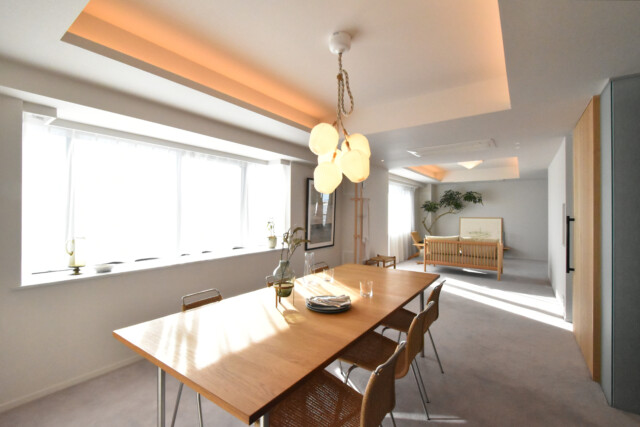 天井はリビング、ダイニングそれぞれ別々に折り上げ天井&間接照明。デザインと光の相乗効果で中心性を高めることによって、広い空間を仕切ることなく居心地のよいエリア分けを実現しています。
