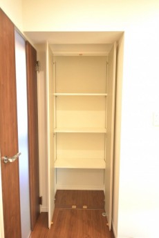 廊下には棚のついた収納もつくられています。掃除用具やスリッパなども廊下に