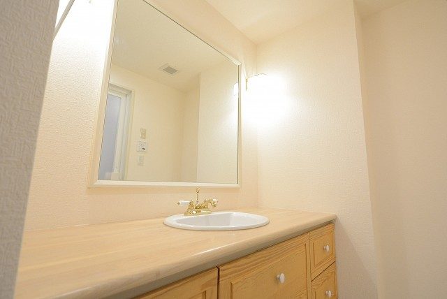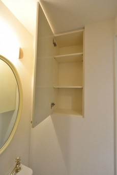 広い室内には洗面台と可愛らしいまるい鏡、鏡の隣には棚があるので、トイレ内はいつも清潔にお使い頂けます。