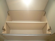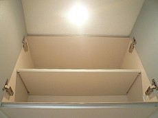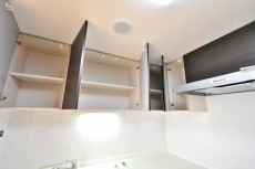 引き戸になっていますので、開け閉めのスペースを気にせず、収納は吊戸棚と右側に調整可能な棚がありますた。充実した収納になっています。