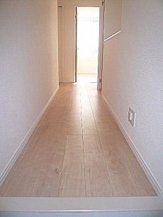 ドアをあけますと廊下の向こうから光が射し込んでいるのがみえます。玄関も広々とゆとりがあります。無垢のフローリングの廊下がソフトな雰囲気を感じさせます。