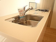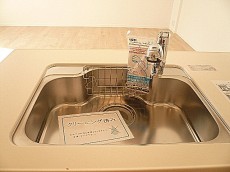 3口のグリル付きガスコンロ、浄水機能付きの水栓、豊富な収納と設備としては申し分ないですね!!