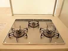 3つ口コンロ前には油はねよけもあり、おしゃれなくもりガラスを前に揚げ物も心配なしです。