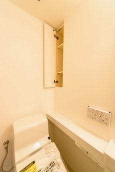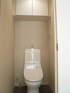 TOTO製洗浄便座付きトイレです。高いところに吊戸棚があり圧迫感を感じなく、扉をあけるとトイレットペーパーもしっかりストックできそうです。