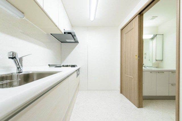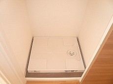 キッチンには洗濯機置場があります。こちらには棚がありませんので、隣に物入があるので、そちらに洗剤などを収納しておいてはいかがでしょうか。