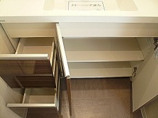 足元の収納は引き出しタイプですので、奥まで無駄なく使うことができます。上から手を伸ばすことができるので腰にも優しいですよ!!
