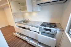 カウンターが天然御影石のシステムキッチン。カッコイイです。