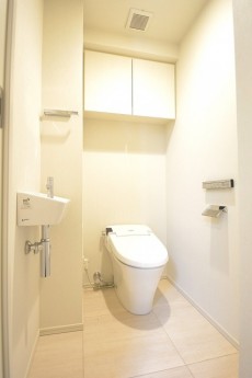 トイレはウォシュレットと手洗い場、吊戸棚付き。