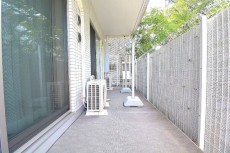 テラスは約9㎡。西向きです。1階なので目の前は網目の細かい柵とさらに向こう側に