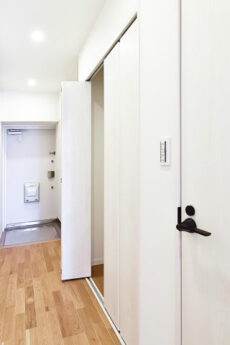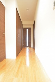 玄関から廊下にかけて、暖色系でまとめることで温かみのある雰囲気に仕上がっています。
