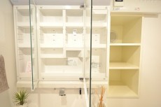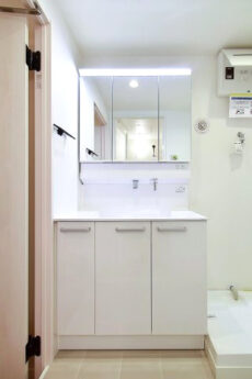 3面鏡の裏が一面収納になってる洗面化粧台。