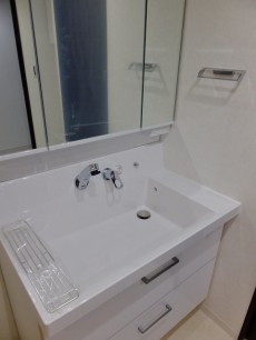 入って正面が洗面台です。左側に水切り用のラックがついているので、石鹸を置いておいたり、コップを置いておいたり、いつでも洗面台を清潔に使っておけますね(^v^)