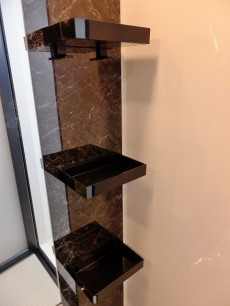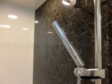 洗面台の左側がバスルームです。大理石調のパネルがラグジュアリー感を高めてくれていますね☆