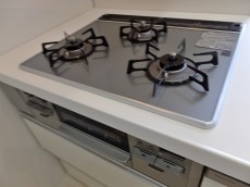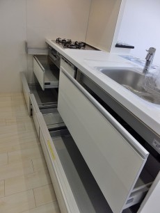 白基調のオシャレなキッチンは浄水器、3口コンロ、食洗機、大容量収納と、4拍子揃っていて、奥様の「あったらいいな」をかなえてくれそうですね(*^。^*)
