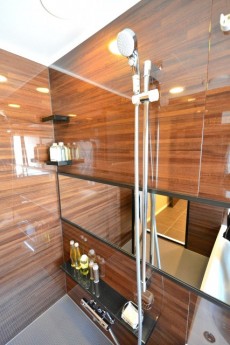 バスルームは高級感のある木目調のパネルを使ったデザイン。北東側に採光・換気用の窓がついているので、室内がとても明るく開放的です☆