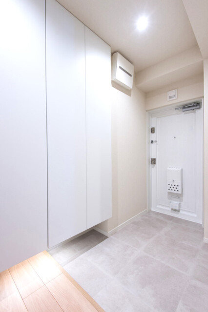 玄関はゆとりのあるサイズ感。白を基調にした明るい雰囲気やフットライトも広々と感じる一因となっています。シューズボックスは収納力抜群のトールタイプ。下の部分が空いているのも、濡れた靴が乾くまで置いておけたりして便利です。