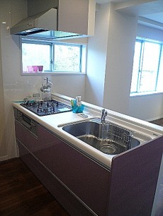 窓があるシステムキッチンです。キッチンカウンター造作、可愛らしい小物をちょこんと置きたくなります~キッチン収納はスライド式収納です。奥まで見やすく仕舞いやすく整理整頓もしやすいですね。収納の色が桃色系になっており柔らかい雰囲気のキッチンです。