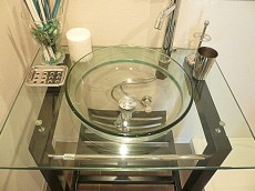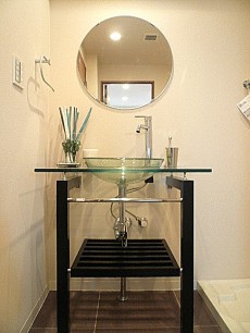 とってもおしゃれな洗面化粧台です。丸いミラーに丸い洗面ボウル、丸みあるタオルハンガーとガラスの作りなので全体に透明感もあり、まるでホテルのようなおしゃれ度アップの洗面台ですね。洗面ボウル下に収納空間があります。カゴなどを置いて活用するのも良いですね。