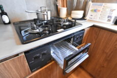 最近は開放的なカウンターキッチンが多い印象ですが、お料理好きの中では根強い人気を誇る独立型。料理に集中出来るのがいいそうです。3口コンロ、グリル、十分な作業スペース、豊富な収納、食器洗浄乾燥機、浄水機能一体型水栓とお料理のためのサポート機能も充実しています。