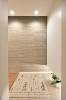 玄関から続く廊下はアースカラーでまとめられた落ち着いた雰囲気。正面のドアにはガラスが使用され、お部屋からの光が溢れる明るい空間になっています。夜になれば、今度はシューズボックス下に付けられたフッドライトが玄関内を明るく照らし、また違った雰囲気になりそうですね。上り口はバリアフリーに配慮されたほぼ段差がないタイプ。永く住むことを考えると嬉しいポイントです♪